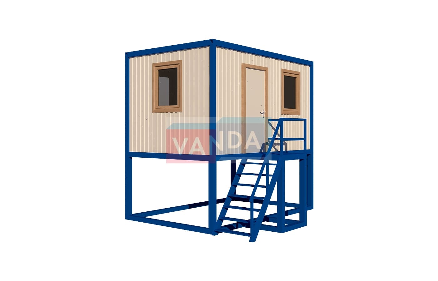 Пост охраны на подиуме №5 (вариант 3) изготавливается из несущего каркаса (верхняя и нижняя обвязка): швеллер 100х50х3 мм., угловые стойки: сложно - гнутый угол 90х90х3 мм., крыша блок-контейнера: металл сварной 0,9-1 мм., качественная наружная отделка: оцинкованный профлист, вспомогательный деревянный каркас (стены) выполнен из брусок 40х75 мм., лаги пола: обрезная доска 40х100 мм., лаги потолка: обрезная доска 40х100 мм., выполнено утепление: Минеральная вата «ISOVER» – 50 мм. и пароизоляция: плёнка техническая, черновой пол состоит из: обрезная доска 20 мм. (2 сорт), чистовой пол покрыт: ДСП строительное 16 мм., отделка пола выполнена из качественных материалов. Контейнер комплектуется окнами: деревянное, двойное остекление 800х1000, входной дверью: ДГ 21-8 обшита снаружи оцинкованным листом, врезной замок и внутренними дверями. Если в БК присутствуют перегородки, то для них используется: брусок 40х50 мм. Лестница постамента имеет перила, тетива лестницы выполнена из профтрубы 30х60 мм., ступени из уголка 25х25х3 мм., просечной лист, перила из профтрубы 20х40 мм., площадка перед входной дверью имеет ограждение.